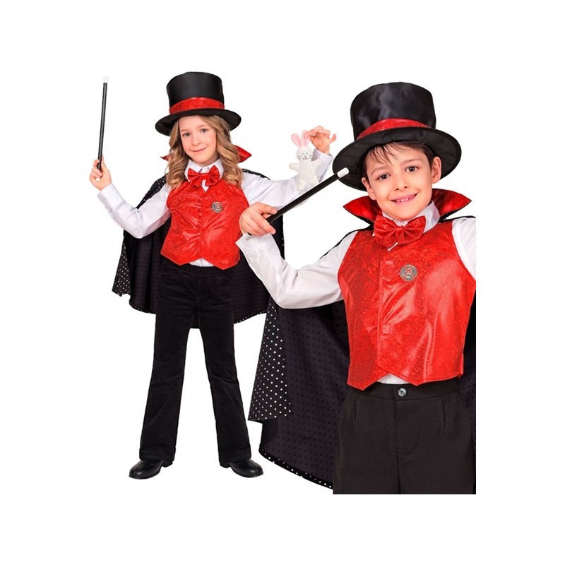 Kit com acessórios de mágico, unisexo, para criança. Inclui: colete vermelho, laço vermelho, capa preta, cartola preta com compartimento de esconderijo, varinha mágica, moeda e coelho. Tamanho: 128cm que corresponde a 5-7 anos.