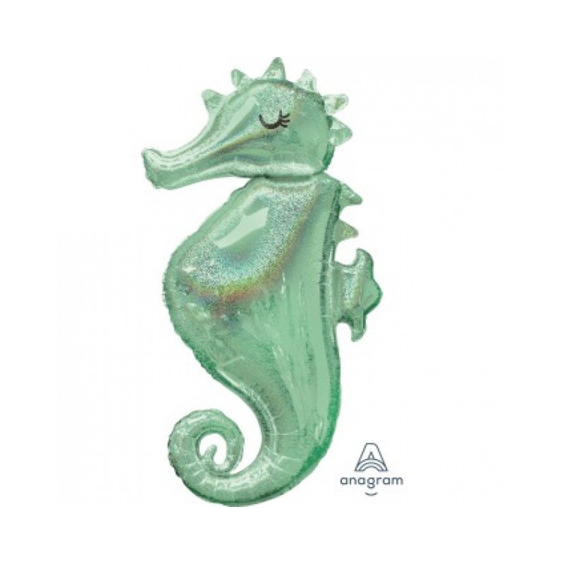 Balão foil no formato de cavalo marinho, em tons de verde-água. Este balão é holográfico (apresenta brilho). Pode ser cheio com ar ou com hélio. Tamanho: 38" - 96cm