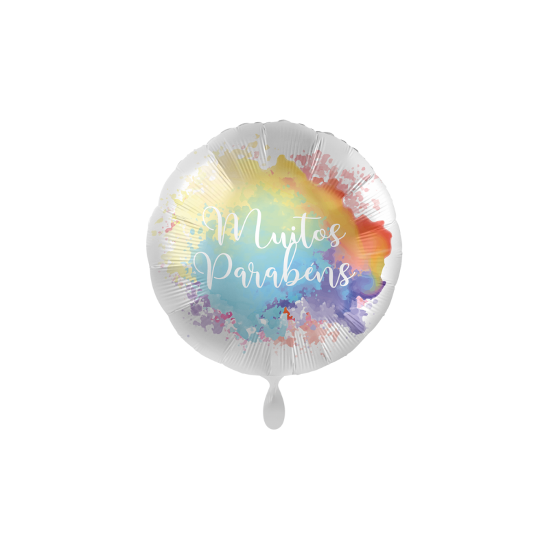 17" Balão foil redondo com a frase "Muitos Parabéns". O balão tem fundo branco e, ao centro, surge uma mancha colorida em estilo aquarela nos vários tons do arco-íris. Ao centro está a expressão "Muitos Parabéns" em branco. É possível encher com hélio ou com ar. Aproximadamente 43cm. "Designed by Mandy"