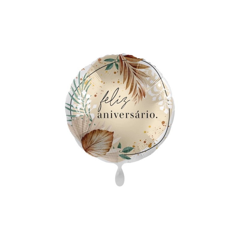 17" Balão foil redondo de aniversário. O balão é nos tons de bege e castanho com decorações de folhagens em branco, verde, beges e castanhos. Ao redor do balão está um círculo a preto e uns salpicos de cor a decorar. Ao centro é visível a expressão "Feliz Aniversário" a preto com dois tipos de lettering. É possível encher com hélio ou com ar. Aproximadamente 43cm. "Designed by Mandy"