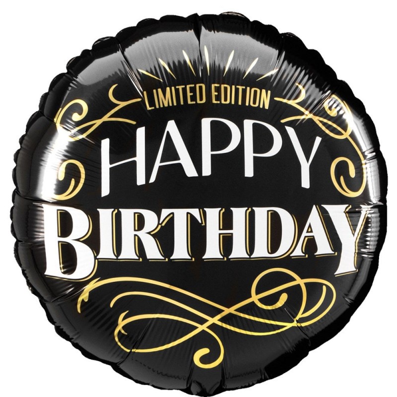 Balão foil em formato redondo, com duas faces diferentes - ambas com o fundo preto, mas uma a dizer "Limited Edition - Happy Birthday" com lettering a dourado e branco; e do outro lado a dizer - "Aged to Perfection" com lettering em dourado e branco. Pode ser cheio com ar ou com hélio. Tamanho: 17" - 43cm