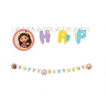 Bandeirola "Happy Birthday" recortada da temática "A casa de bonecas da Gabby" colorida onde aparece a Gabby e os seus amigos pandinha e o almofagato. Tamanho: 2m.