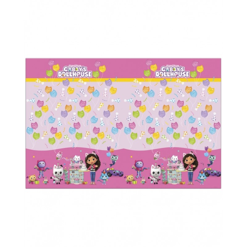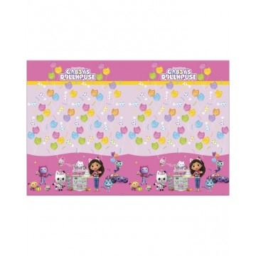 Toalha em plástico do tema "A Casa De Bonecas Da Gabby". O topo da toalha é em rosa claro e é decorado com alguns elementos relacionados com o tema como balões com carinha de gato e chapéus de festa. A barra da toalha é em rosa mais forte e é decorada com as personagens da Casa de Bonecas da Gabby. Medidas 120cm * 180cm