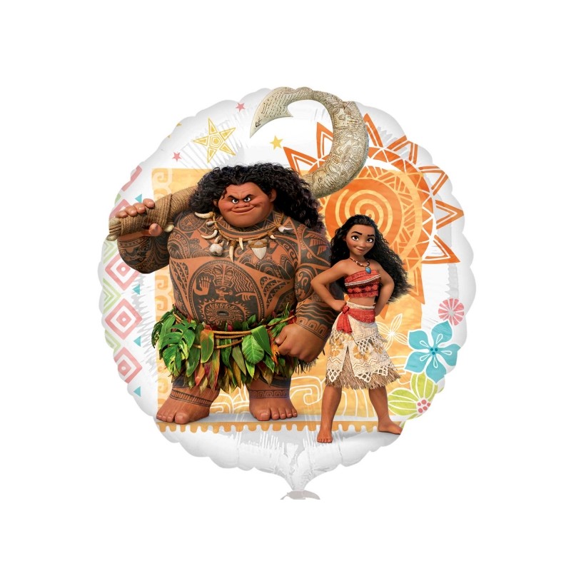 Balão Foil no formato redondo com as personagens Moana (Vaiana) e Maui. Pode ser cheio com ar ou com hélio. Tamanho: 17" - 43cm