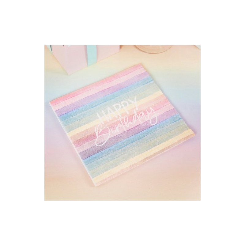 Embalagem com 16 guardanapos a dizer "Happy Birthday", com riscas nas cores do arco-íris, em tons pastel. Tamanho: 33cm x 33cm