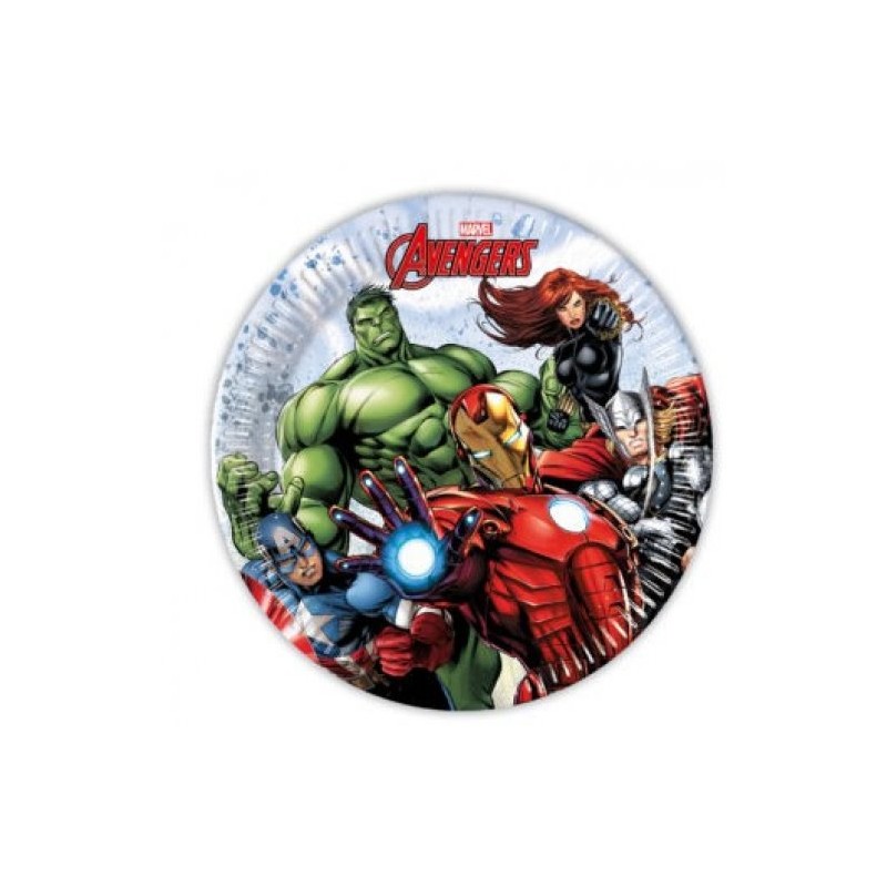 Embalagem com 8 pratos em formato redondo, de papel, do tema "Avengers - Vingadores". Tamanho: 20cm