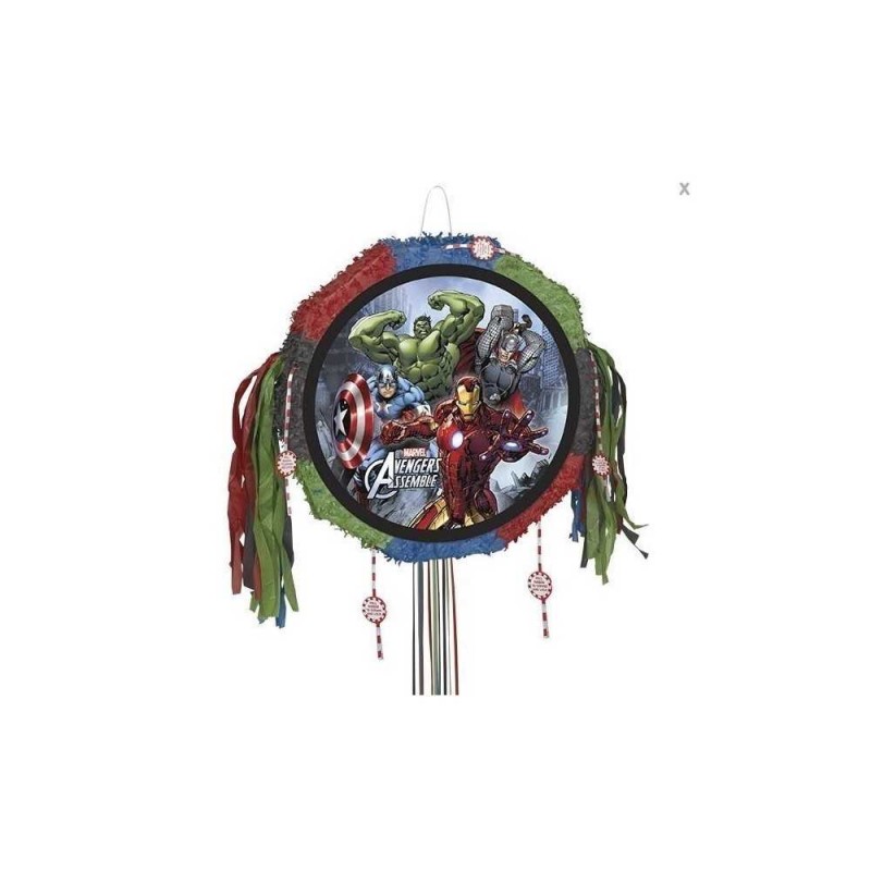 Pinhata em formato redondo com a imgem dos Vingadores ("Avengers"): Capitão América, Hulk, Homem de Ferro e o Thor. Com aba para pendurar e orificio para colocar o que quiser: doces, brindes, confettis, etc. Vem Vazia. Pinhata de bater ou de puxar as fitas.