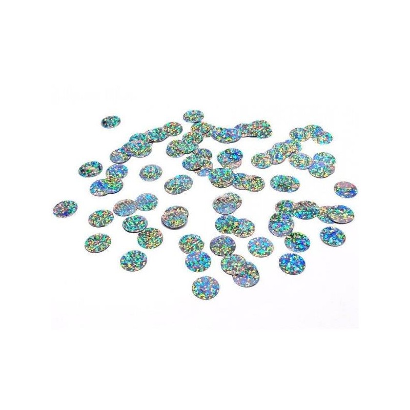Embalagem com 15g de confettis em formato redondo, na cor prata holográfico.