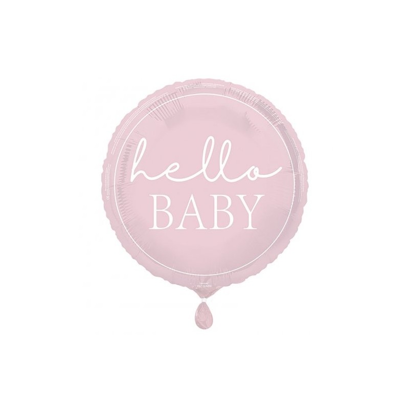 Balão foil no formato redondo, com fundo rosa e lettering "hello BABY" a branco. Pode ser cheio com hélio ou com ar. Tamanho: 18" - 45.7cm