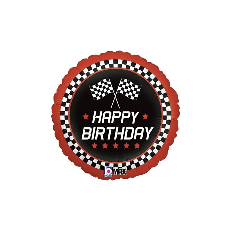 18" Balão foil redondo temático de corridas. O balão é decorado com o padrão xadrez, com duas bandeiras de corrida e com a expressão "Happy Birthday". É possível encher com hélio ou com ar. Aproximadamente 46cm