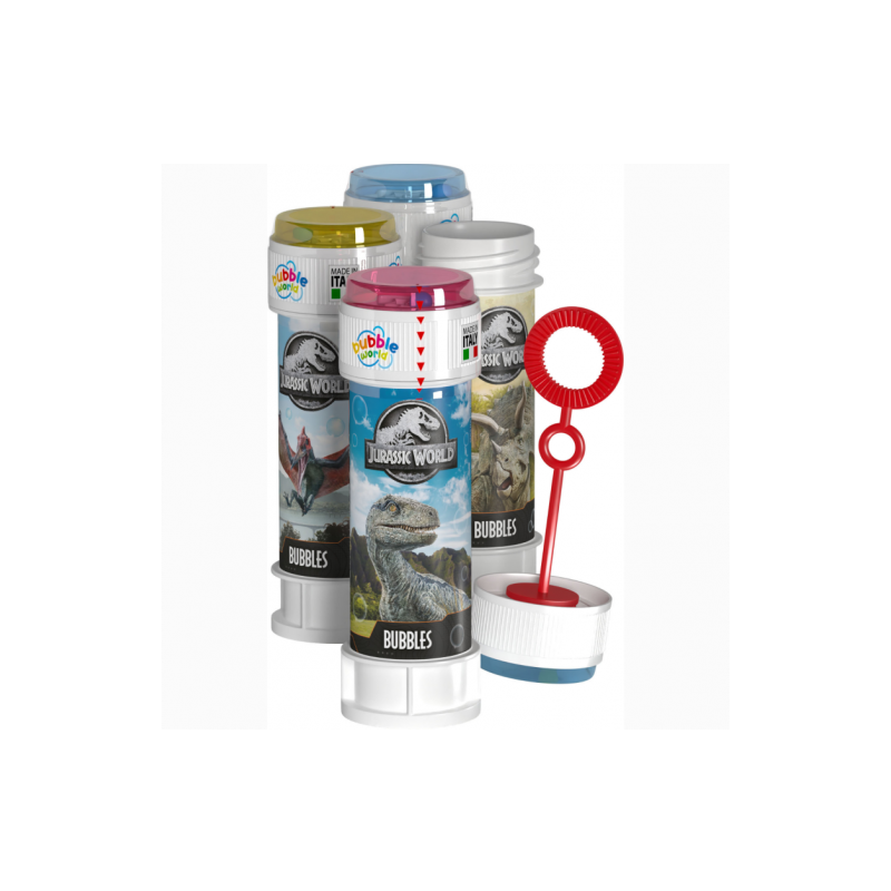 Frasco de bolas de sabão do tema Dinossauros do Mundo Jurássico. Capacidade: 60ml.