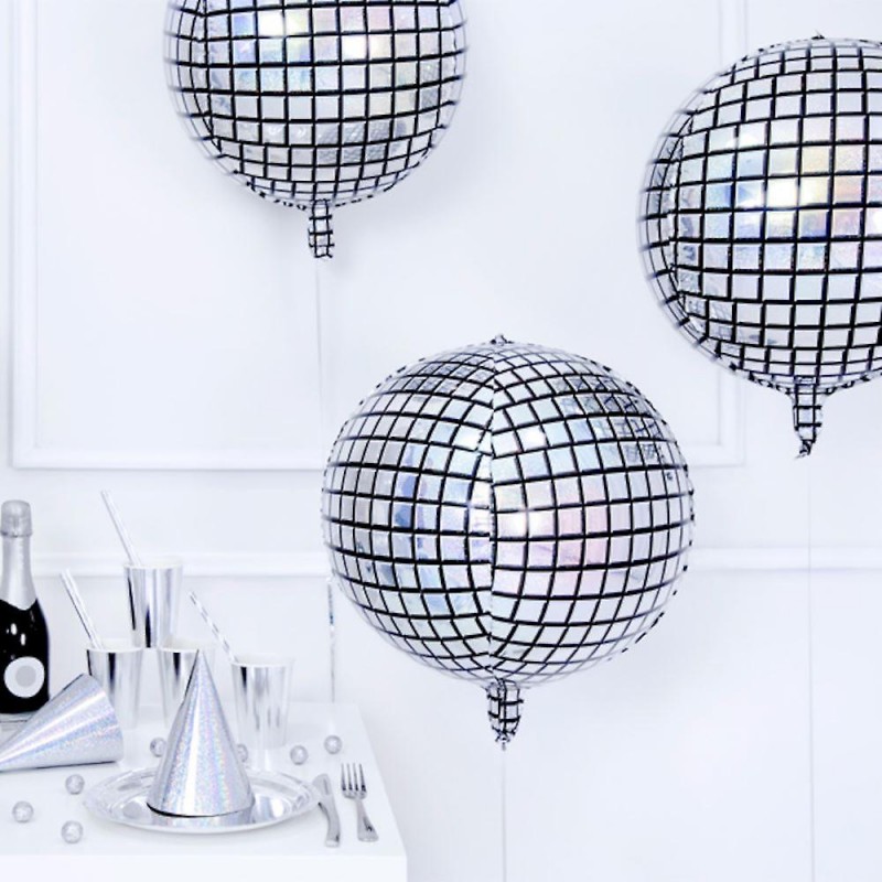 16" Balão foil formato de bola de espelhos de discoteca. O balão cheio fica totalmente redondo. É possível encher com hélio ou com ar. Aproximademente 40cm