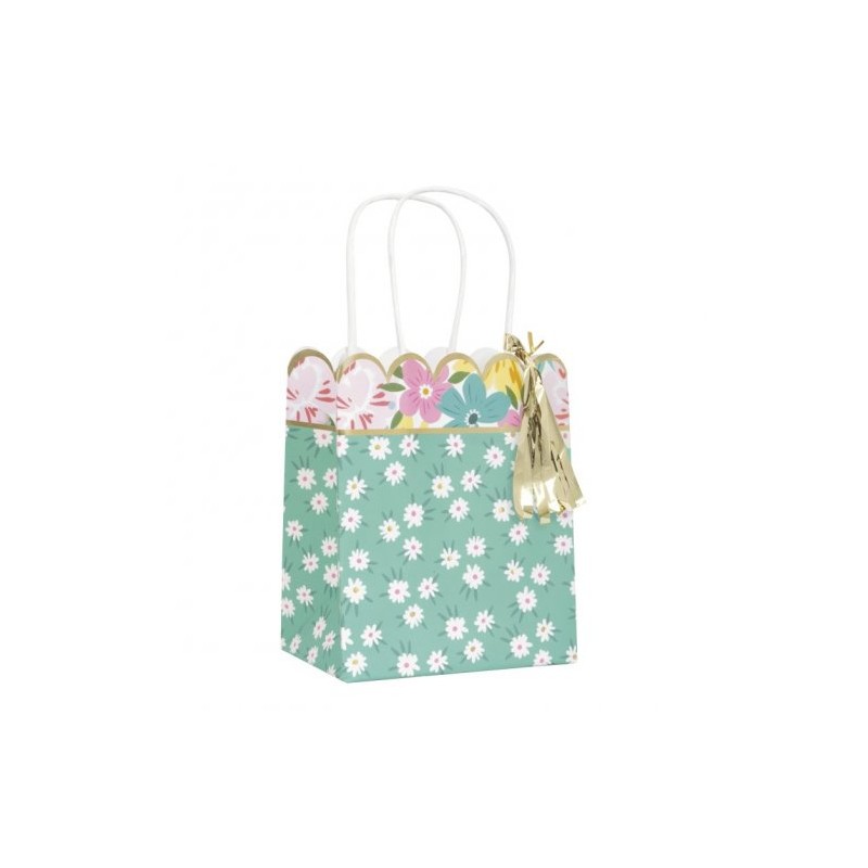 Conjunto de 3 sacos de papel, adornados com flores primaveris, em tos de verde água, rosa, branco e amarelo; com aba. Tamanho: 15 x 12.5 x 7.5cm