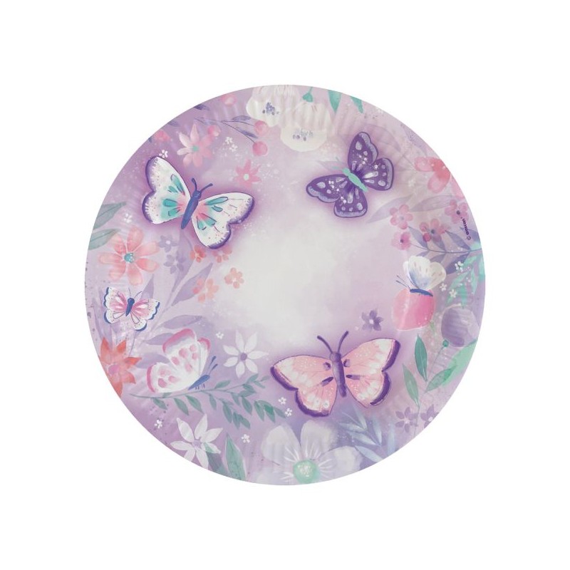 Embalagem com 8 pratos, de papel, em formato redondo, com fundo lilás e motivos de borboletas e flores. Tamanho: 23cm