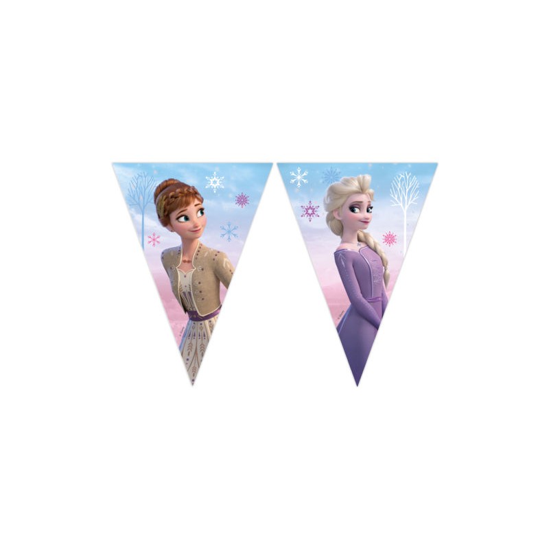 Bandeirola Triangular de papel da linha "Frozen Wind Spirit", com a imagem da Elsa e da Anna. Tamanho: 2.3m