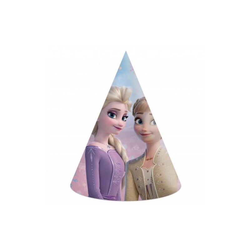 6 chapéus de festa de papel com o tema Frozen 2 ´Wind Spirit. Contém a imagem da Elsa e da Ana em todos os chapéus.