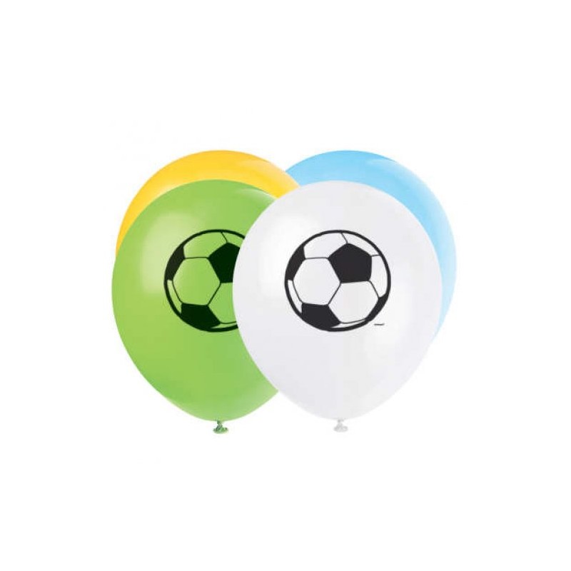 Embalagem com 8 balões de látex com a impressão da bola de futebol, nas cores: branco, azul, amarelo e verde. Tamanho: 30.48cm