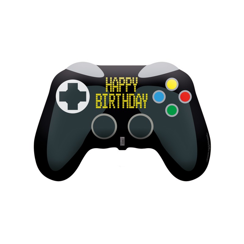 Balão Foil no formato de comando de jogos eletrónicos, a dizer "Happy Birthday". Pode ser cheio com ar ou com hélio. Tamanho: 52cm