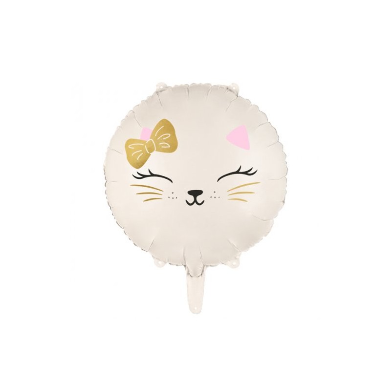 Balão foil em formato redondo, com a face de uma gatinha, em cor de rosa pastel, com lacinho a dourado. Pode ser cheio com hélio ou com ar. Inclui uma palinha para o enchimento a ar. Tamanho do balão vazio - 18" - 45cm. Tamanho do balão quando cheio - 14" - 35cm