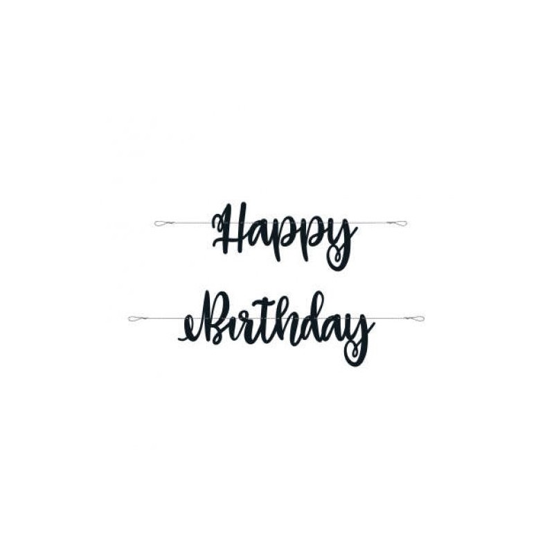 Bandeirola de papel, recortada, com o lettering "Happy Birthday" a preto. Tamanho: 2.13m