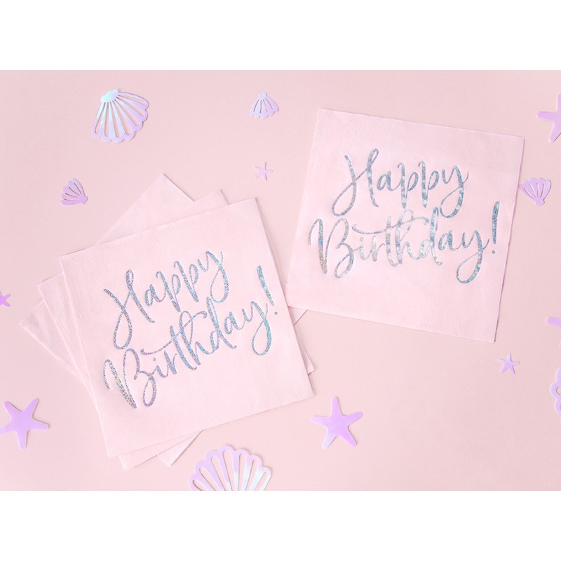 Embalagem com 20 guardanapos cor de rosa com "Happy Birthday" iridescente. Medidas: 33 cm x 33cm