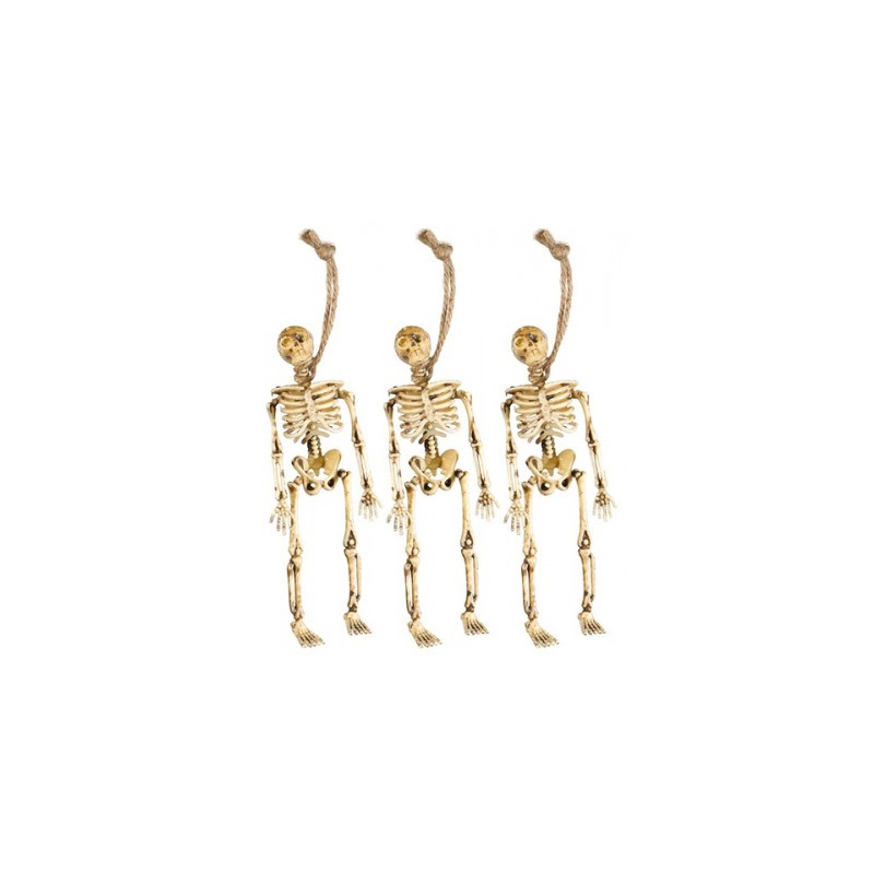 Embalagem com 3 esqueletos decorativos de pendurar. Tamanho: 15cm de altura