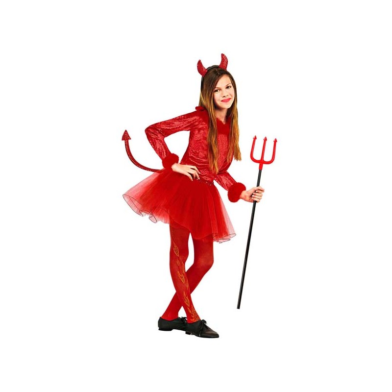 Disfarce de Diaba para criança. Inclui: Collant com detalhes de penas; Saia/ tutu de tule vermelho, com cauda de diabo. com lantejoulas e bandolete com chifres com lantejoulas vermelhas. Tamanho: 11-13 anos - 158cm