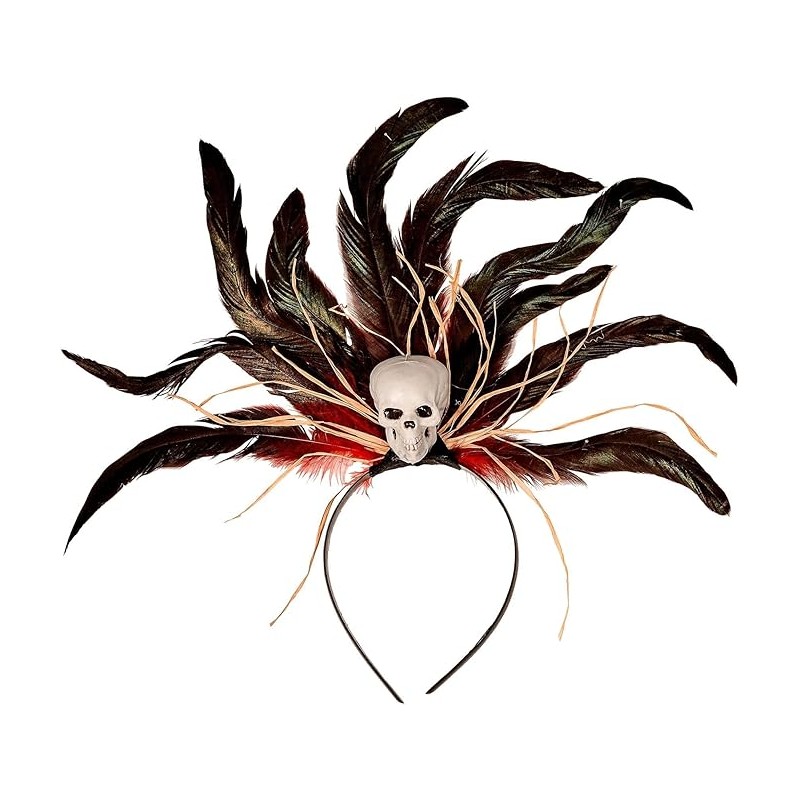 Acessório - Bandolete Voodoo - aodrnada com uma caveira branca, ráfia e penas verde/vermelhas. Tamanho: Único para adulto.