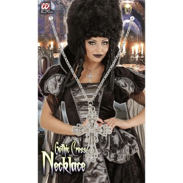 Colar Gótico com crucifixo (Cruz) detalhado com pequenos brilhantes em prata e branco. Tamanho único. Acessório para adulto.