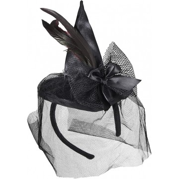 Bandolete com Mini Chapéu de Bruxa adornado com Penas e Véu, Todo em Preto. Acessório de tamanho único apra adulto.
