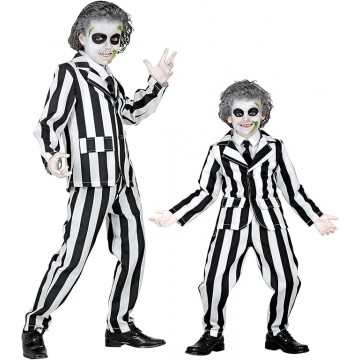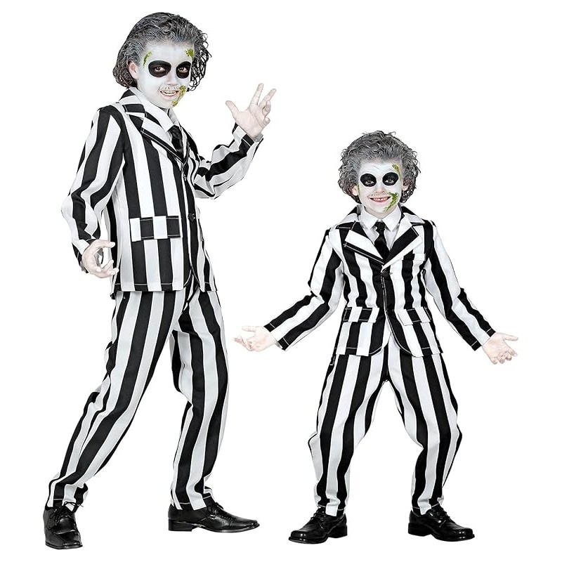 Disfarce "Sleazy Ghost" para criança, alusivo ao Filme "Beetlejuice". Inclui: Casaco, calças e Gravata. Tamanho: 5-7 anos (128cm)