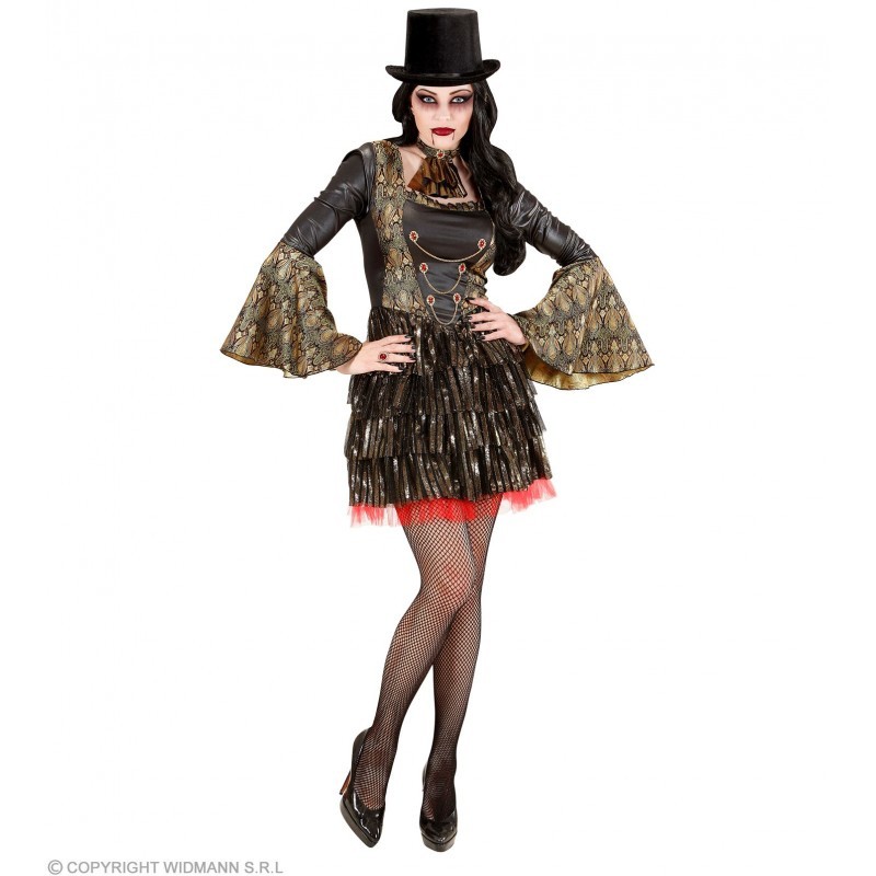Disfarce de Vampira Gótica para adulto. Inclui: Vestido Preto com mangas Longas, todo trabalhado com detalhes a dourado; colarinho. Tamanho: M