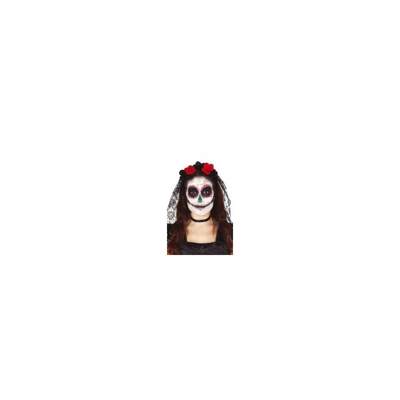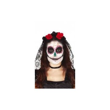 Fita Para Cabelo Flores Coloridas (Vermelho,Laranja,Rosa,Amarelo) com véu rendado preto. Tamanho único para adulto, alusivo ao "Dia dos Mortos", tradição mexicana.