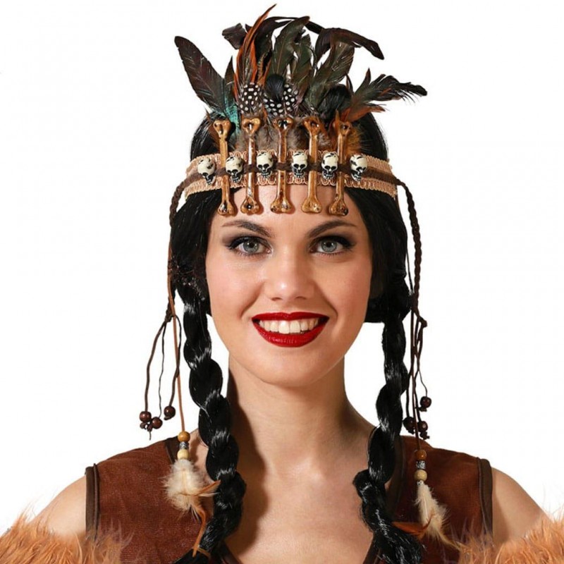 Fita para Cabelo com Ossos, Mini Caveiras e Penas. Acessório para complementar disfarces de indigenas, voodoo, entre outros.