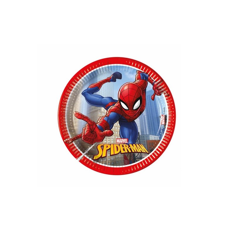 Embalagem com oito pratos de papel redondos do tema do Homem Aranha. O prato é decorado com o Homem Aranha a fazer a pose de lançamento de teia de aranha e o rebordo do prato é em vermelho. Aproximadamente 20 cm.