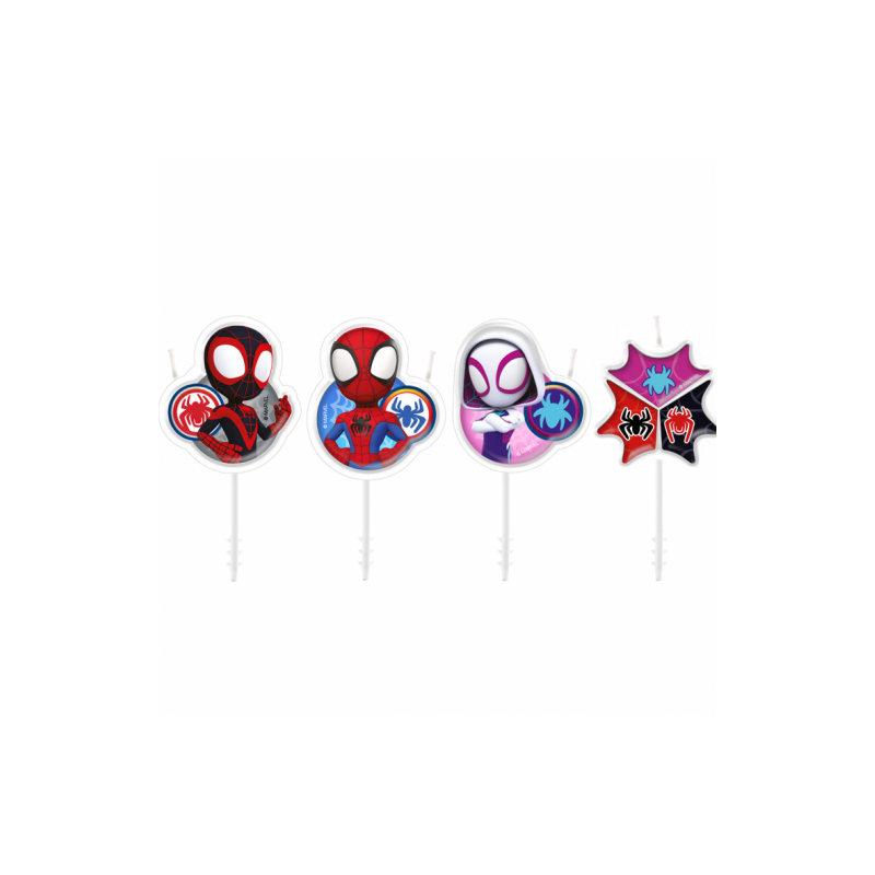 Embalagem com 4 velas do tema "Spidey" com a figura do Spidey, da Ghost, do Miles, e uma com os 3 amuletos. Tamanho: 3cm x 4cm