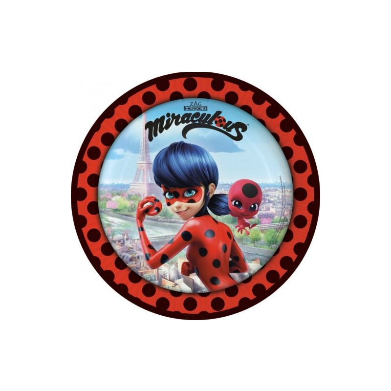 Embalage com 8 pratos de papel, em formato redondo, da "Miraculous" (Ladybug). Tamanho: 23cm