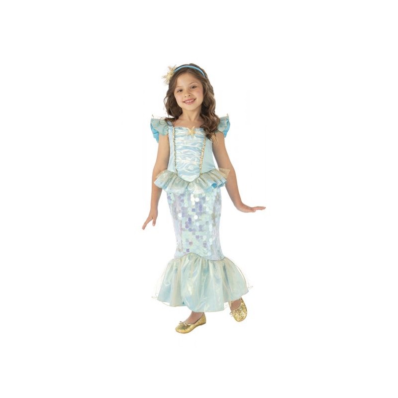 Disfarce de Sereia para criança. Inclui: vestido justo estilo sereria, em tons de verde água, com adornos a dourado e uma estrela do mar, tule arrendado dourado e lantejoulas iridescentes. Inclui a bandoelte para a cabeça adornada com tule e uma estrela do mar. Tamanho: 3-4 anos (111.30cm - 121.40cm)