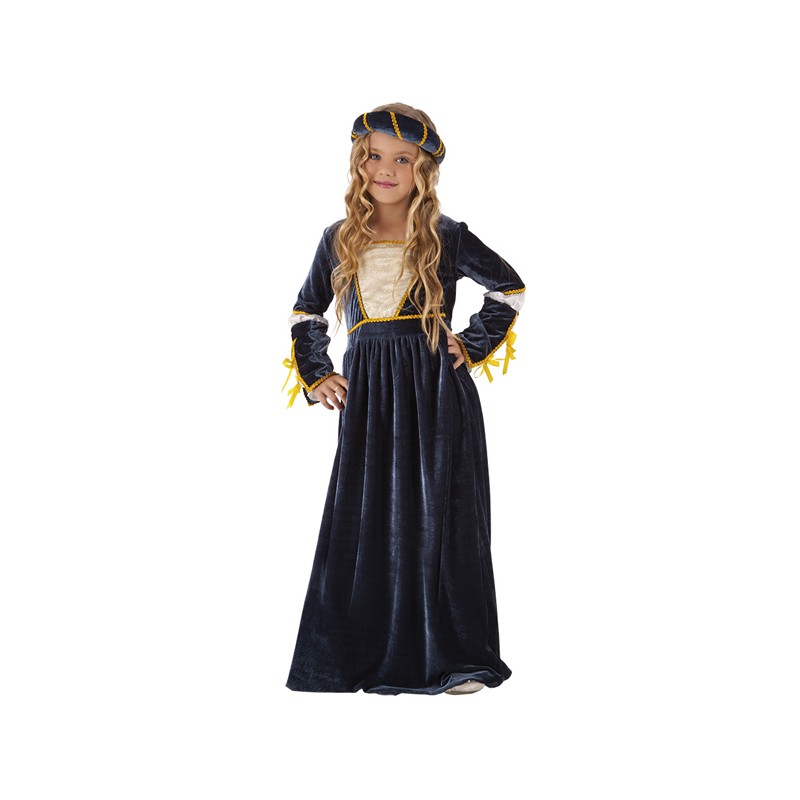 Disfarce para criança de dama medieval. Inclui: vestido e acessório para a cabeça na cor azul com detalhes a dourado.