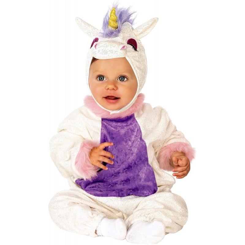 Disfarce de unicórnio para bebé. Inclui: fato completo com capuz a imitar a cabeça de um unicórnio, em tons de branco e roxo.