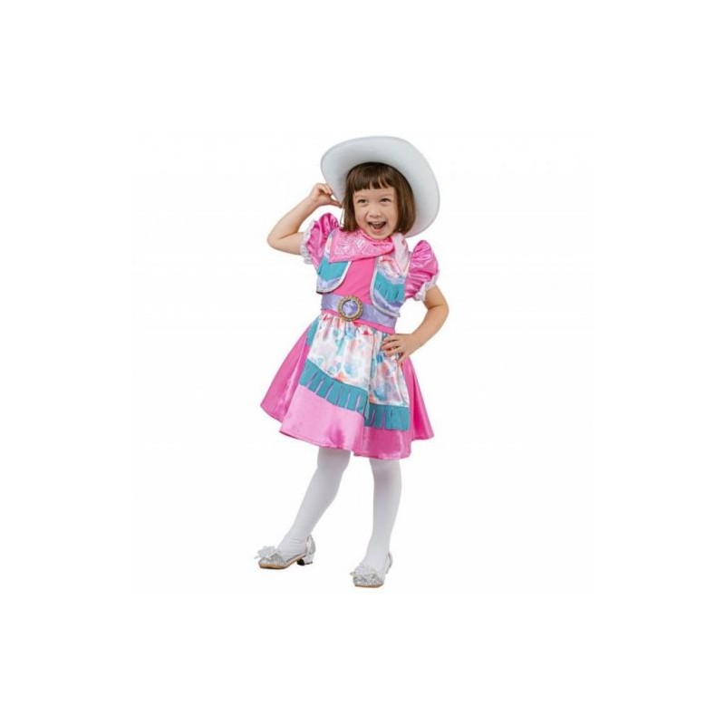 Disfarce vaqueira (cowgirl) para criança. Inclui: Vestido, bandana (lenço), cinto e chapéu. Tamanho: 92/104cm que corresponde a 3-4 anos.