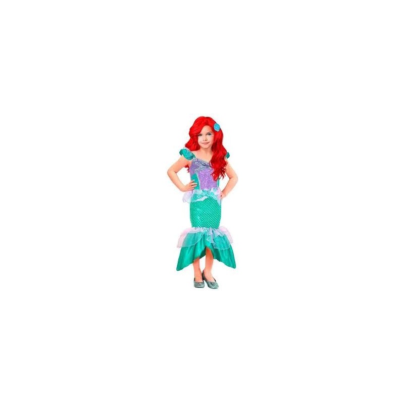 Disfarce de Sereia para criança, alusivo à "Pequena Sereia". Inlcui: Vestido com cauda, com detalhes holográficos e gancho para o cabelo em formato de concha. Tamanho: 140cm que corresponde a 8-10 anos
