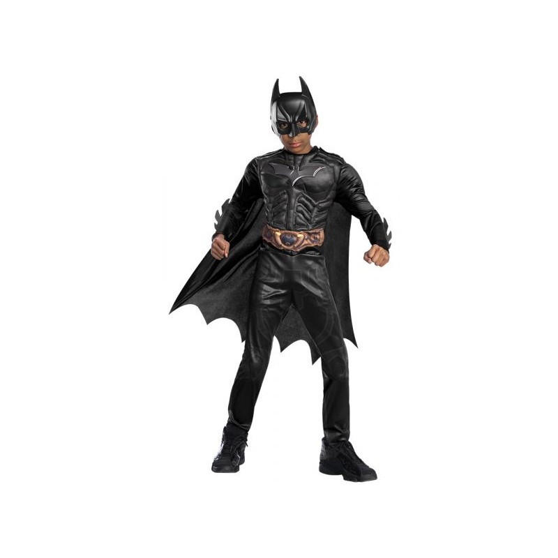 Disfarce de Batman para criança. Inclui: fato completo musculado em tons de preto com cinto a dourado, com capa preta recortada e máscara preta. Tamanho: 5-6 anos - 1116cm.