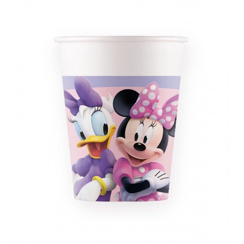 Embalagem com 8 copos de papel do tema da Minnie. Os copos são rosa com uma barra em lilás e têm a Minnie e a Margarida a decorar. Capacidade 200ml