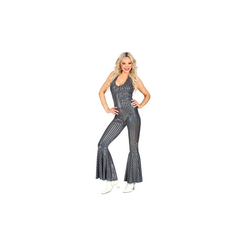 Disfarce para adulto dos anos 70, "Disco Style". Inclui: macacão prata e preto, com efeito holográfico, decotado, de atar atrás no pescoço. Tamanho: L