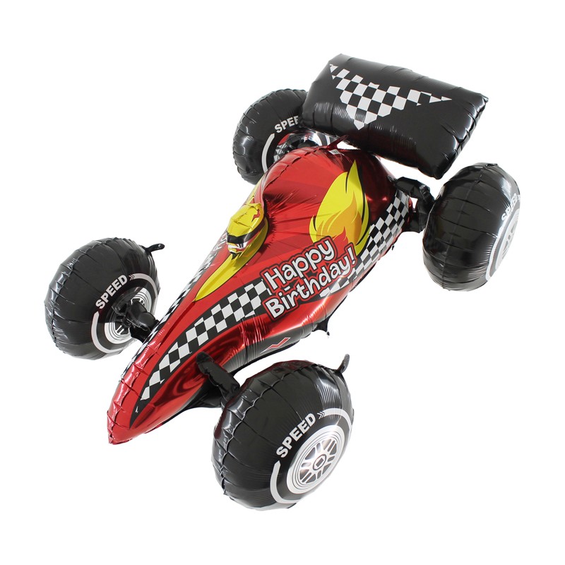 Balão foil em formato de carro desportivo tridimensional, a dizer "Happy Birthday". Tamanho: 3 FT - 91cm. Aconcelha-se a ser cheio a hélio para que se possa manter direito.