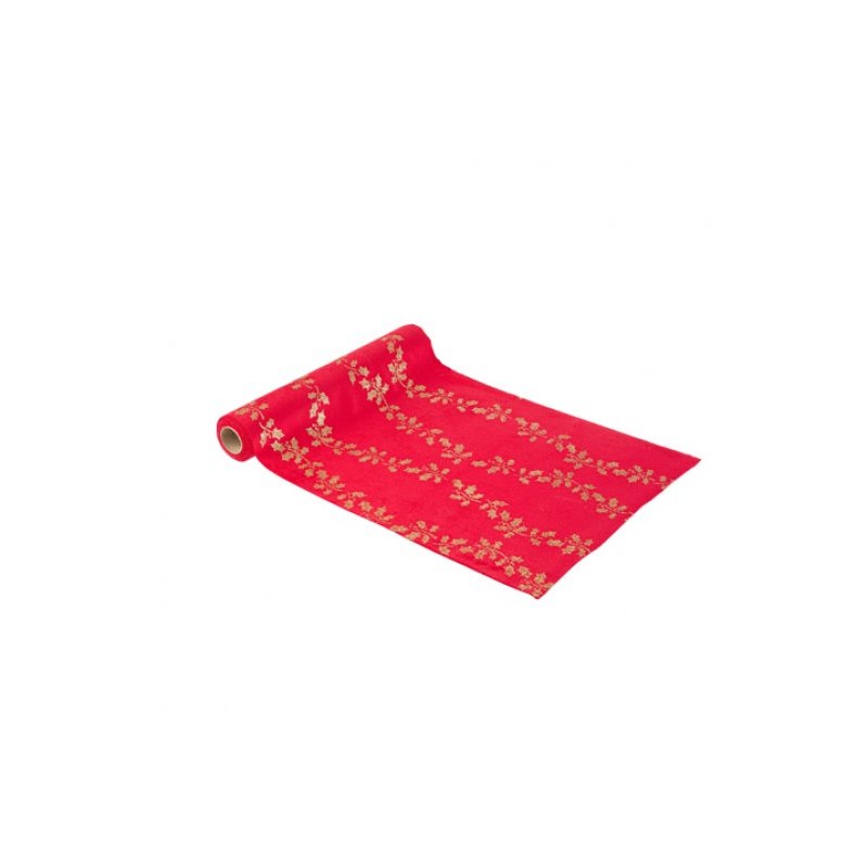 Corredor de mesa veludo vermelho com motivos de azevinhos a gliter dourado. Tamanho: 28cm x 3m