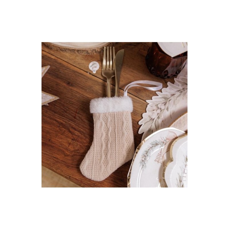 Meia de tricot natalicia bege e branca para: presentes, porta talheres ou decoração natalicia. Tamanho: 14cm x 9.5cm