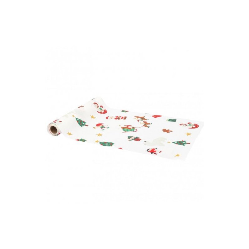 Corredor de mesa de tecido branco com motivos natalicios: pai natal, doende, rena, estrelas, presentes, pinheiro de natal, etc. Tamanho: 28cm x 3m