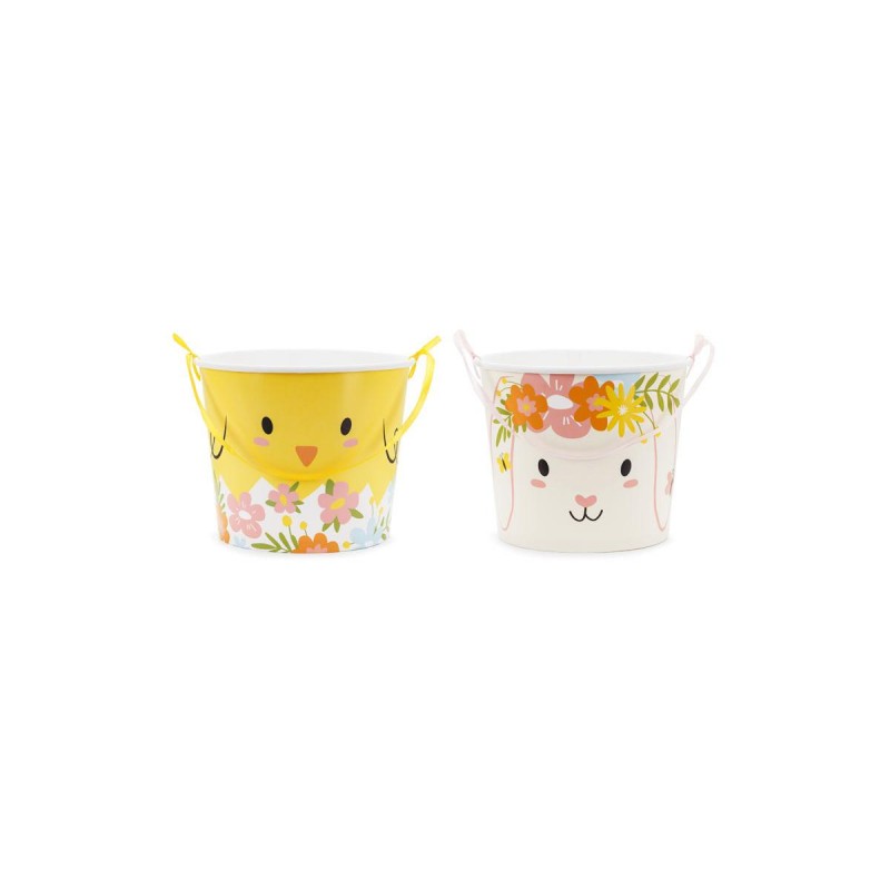 Embalagem com 2 baldes de papel para doces/ brindes. Um balde de pintainho e outro de coelhinho adornados com motivos de flores. Tamanho: 14cm